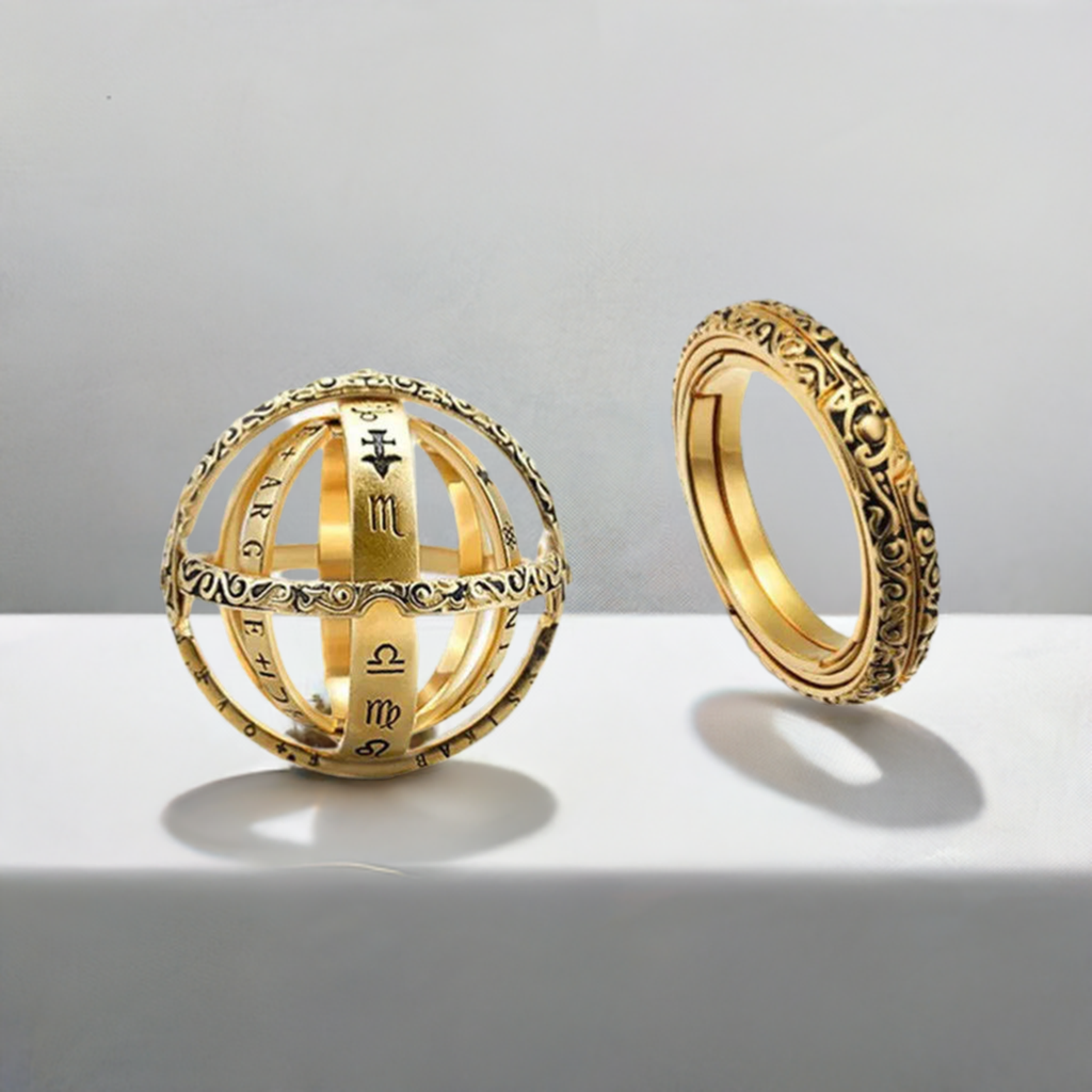 Adoptez l'élégance et le mystère avec la bague sphère astronomique dorée, un bijou inspiré des savoirs ancestraux. Véritable hommage aux instruments astronomiques anciens, elle est composée de cinq anneaux rotatifs ingénieusement assemblés.