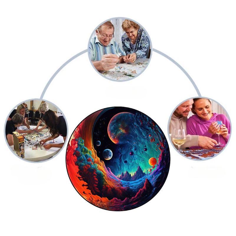 Plongez dans un univers vibrant avec ce puzzle rond représentant un paysage spatial haut en couleur 🌌✨