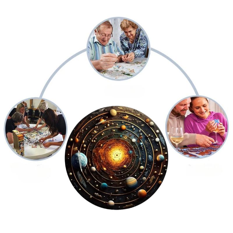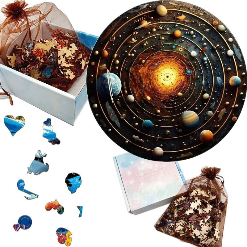 Plongez dans les mystères de l’univers avec ce puzzle rond en bois représentant le système solaire. Chaque planète, du soleil rayonnant à Neptune, est finement illustrée pour offrir une expérience à la fois éducative et artistique.